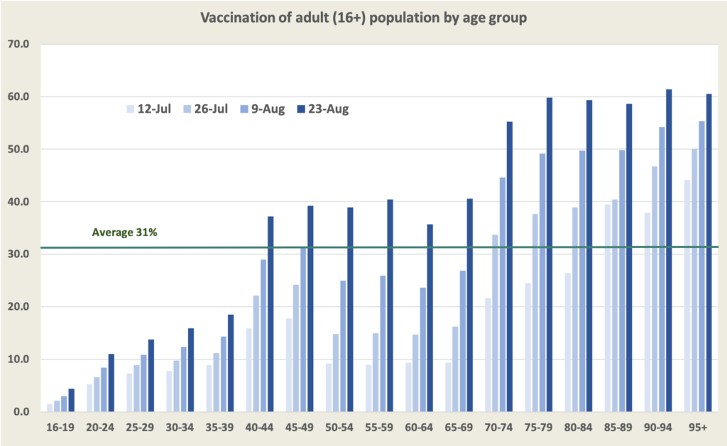 From a national perspective vaccination is proceeding quickly. Every week sees three or four more percent of the population with two-dose vaccination. The rate of uptake of first-dose vaccination, a forecast of full vaccination rates in a few weeks, is even higher.