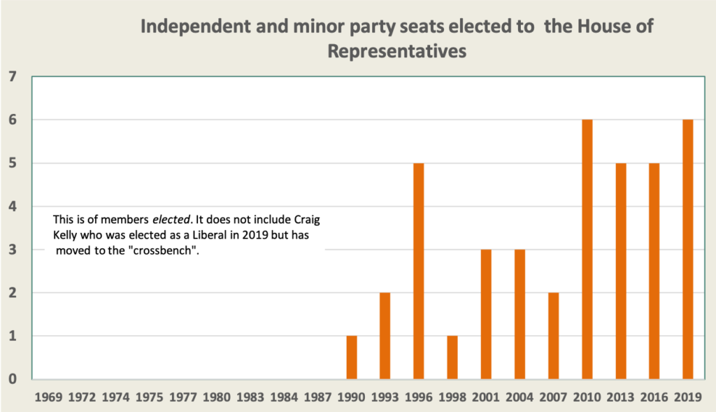 In fact it is very unusual for executive government to have control of parliament. Apart from a brief period from 2004 to 2007, when the Coalition had a slim senate majority, we have to go back to the 1950s before the DLP emerged from a Labor split to find an executive government with full support of parliament. And for the last thirty years there have been more independents and members of minor parties elected to the House of Representatives, as shown in the graph below.