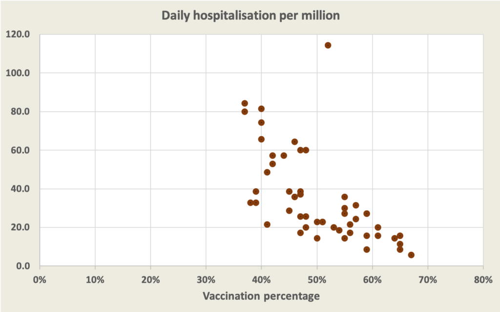 One inference we can cautiously draw from these diagrams is that there are significant benefits in pushing vaccination rates up to high levels. Another, which should be of concern in Australia, is that even the most vaccinated US states still have daily death rates in the order of 1.0 per million. In Australia that would translate to about 25 deaths a day or 9000 a year. For every death there are generally around 10 hospitalisations, and those hospitalisations are often long-stay.