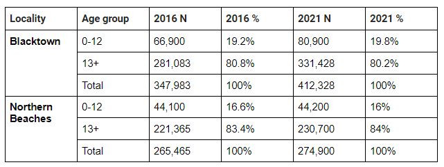 It may be rather easier to reach the absolute number of 80 per cent of the population over 12 years of age in some places than others. The difference depends on what proportion of the total population in each local government area (LGA) in NSW is over 12 years of age. Sitting behind the 80 per cent figure may be an assumption that every LGA has a similar age and socio-cultural profile.