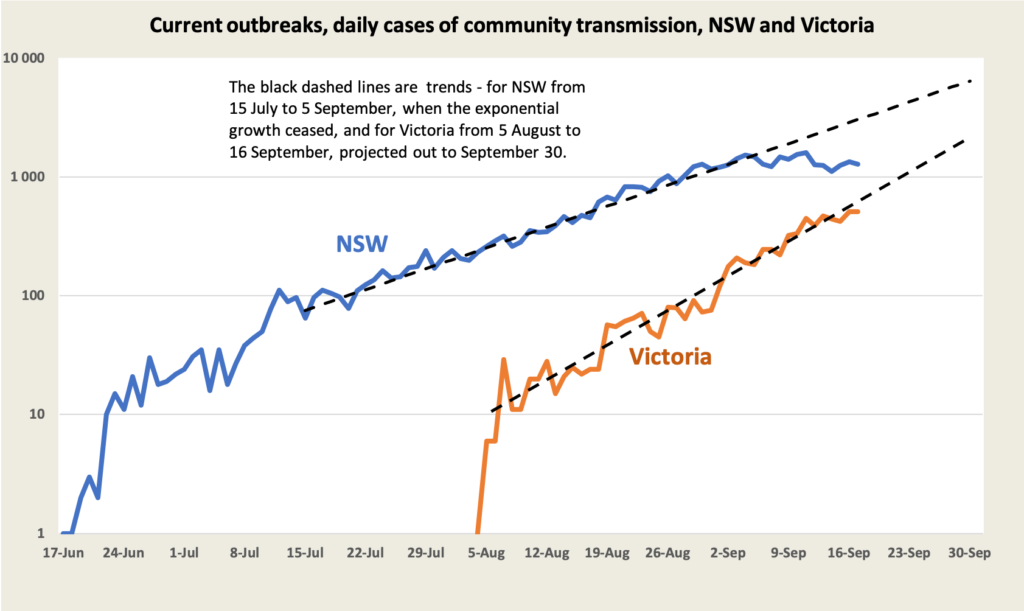 The good news comes from New South Wales where reported cases are no longer growing. The bad news comes from Victoria where cases are still on a path of strong exponential growth, doubling every seven days. (The equation for Victorian case numbers is 8.5086e0.0972x, where x is the number of days since August 5. The coefficient of correlation is 0.9705.)