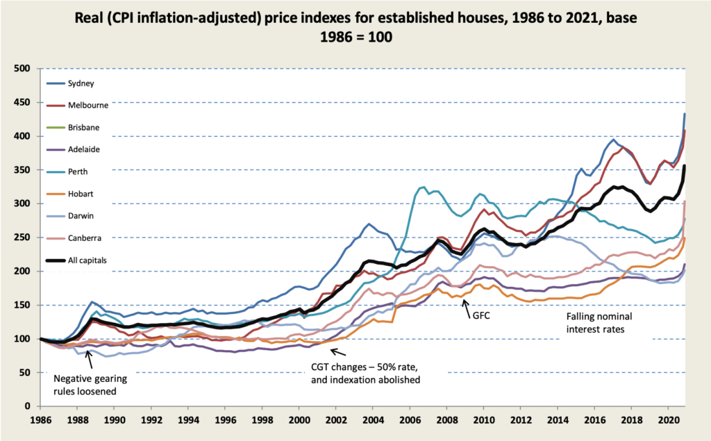 The main driver of current housing price inflation is low interest rates, but it’s not the only driver. Saul Eslake calls for an increase in housing supply, tax reform, and the abolition of grants pushing money into the demand side, “in particular elevated cash grants to would-be home buyers that end up in the pockets of vendors and tax preferences that enable property investors to elbow aside would-be first home buyers.” Eslake also provides a history of grants to buyers in a short chat (two minutes) on Tasmanian radio.