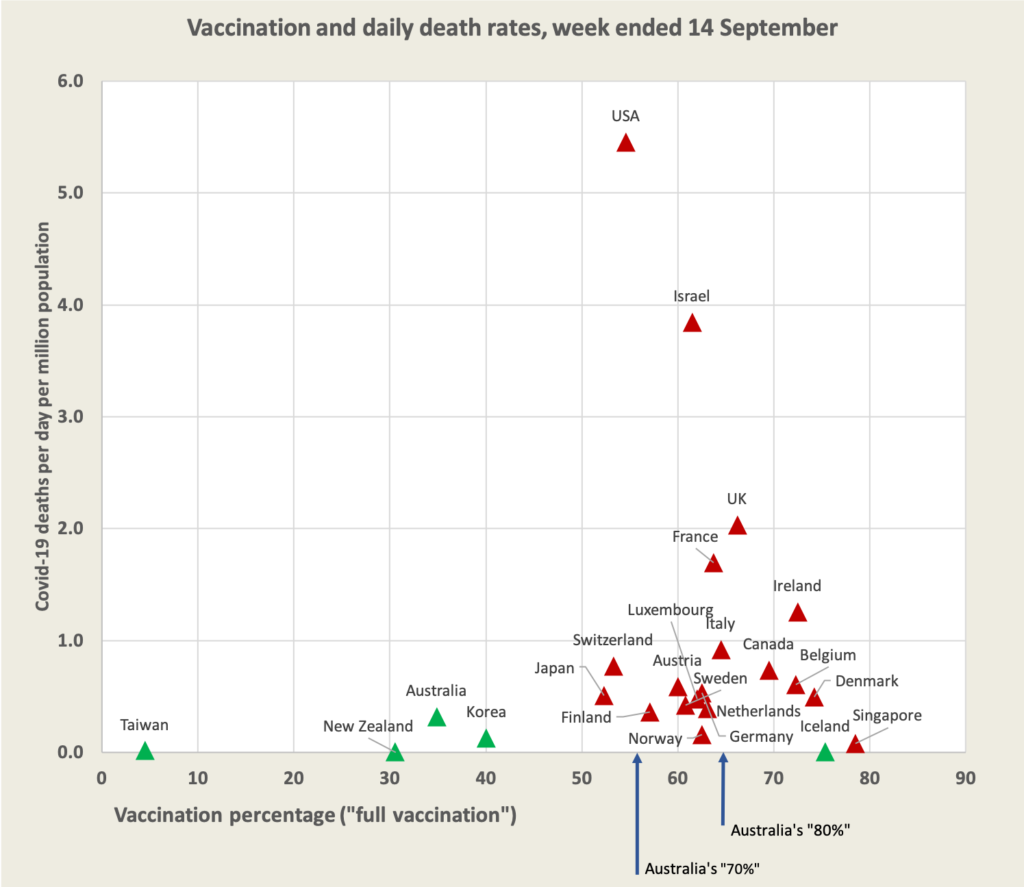 The green markers denote island countries that have no significant background of immunity from earlier exposure to COVID-19. And on the X axis are marked Australia’s two targets “70 per cent” (actually 56 per cent), and “80 per cent” (actually 64 per cent).
