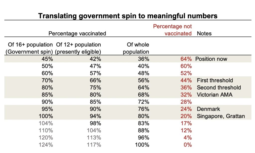 For that reason we are re-presenting the table matching the “adult” percentages to the 12+ percentages, the whole population percentages, and, most importantly, the percentage of Australians unvaccinated.