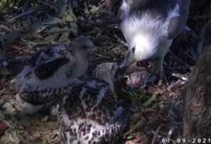 Two years ago I reported regularly on the mating of two sea eagles near the Parramatta River in Sydney and the subsequent egg laying, hatching and development of two chicks. Well, our metropolitan raptors have been breeding again this year and two chicks hatched in late July. They are developing well, as demonstrated by the screen shot below taken on September 7. You can follow their further development and fledging, which should occur in mid-October, on Sea-EagleCAM.