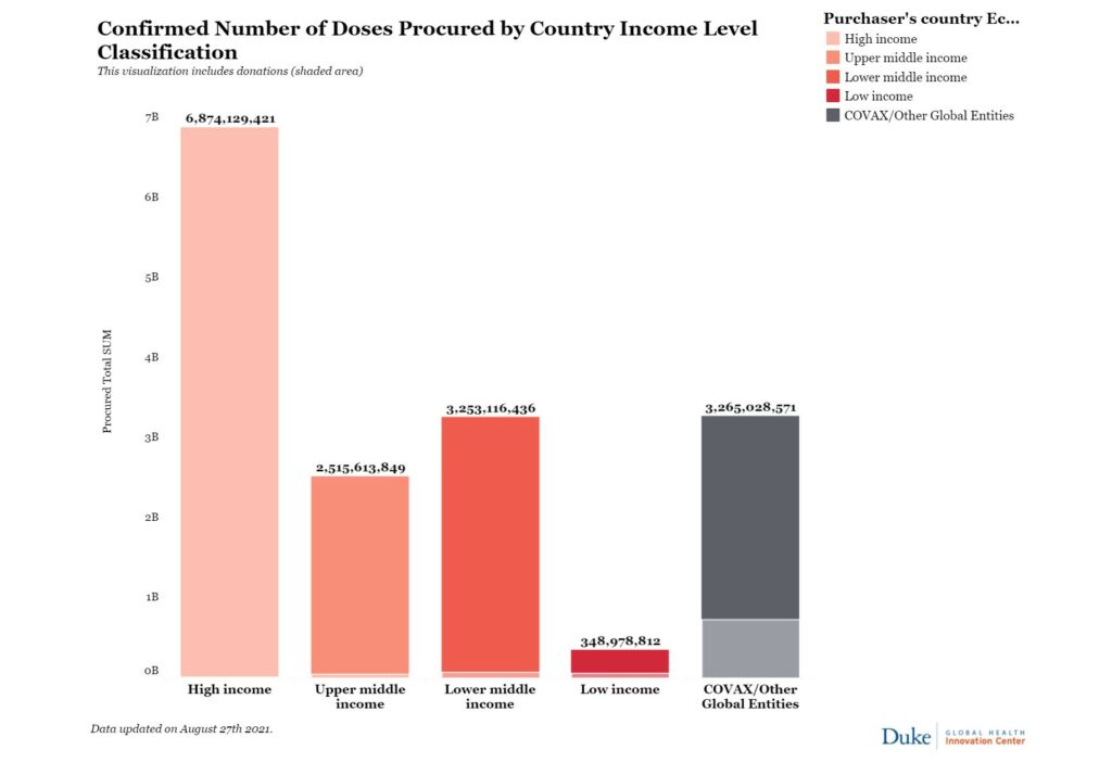 This chart by the Launch & Scale Speedometer (Duke University) shows which countries have procured vaccine doses (confirmed doses). Again, HICs have the largest number of confirmed doses.