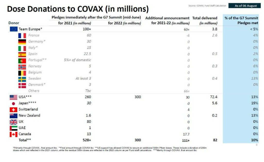In June, the G7 pledged substantial vaccine donations to COVAX, the program that was designed to support LMICs in procuring vaccines. However, only 10% of the G7 pledges have been delivered so far, per information shared by chief economist of the International Monetary Fund.
