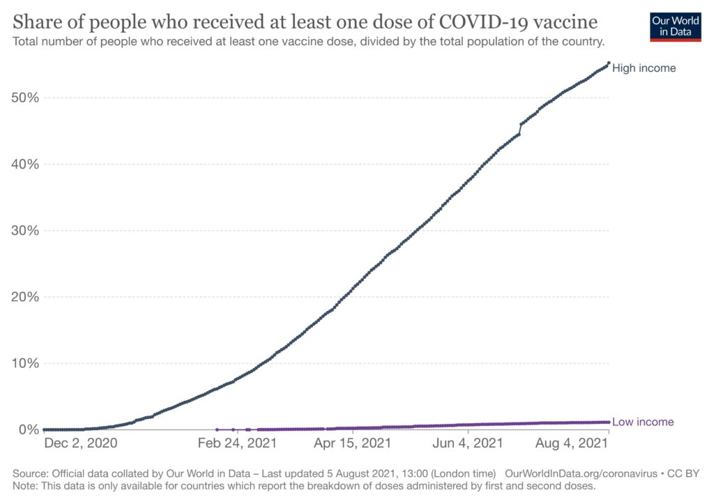 This graph from Our World in Data shows a rapidly increasing coverage in high-income countries (HIC), while the trend is virtually flat for low-income countries (LIC).