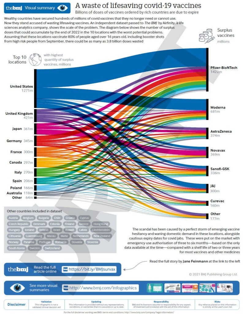 This analysis, published in the BMJ (corrected graphic below) shows the number of surplus doses that could accumulate by the end of 2022 in the 10 locations with the greatest potential waste. Billions of doses of vaccines purchased by rich nations are due to expire.
