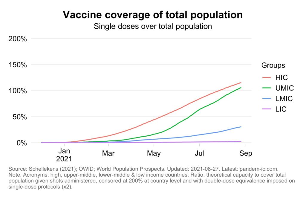 This graph from pandem-ic shows that UMICs are catching up quickly to HICs, but LMICs and especially LICs have not improved much.