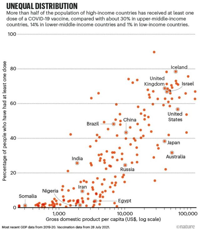 This graph, from a _Nature_ paper by Amy Maxmen, shows the unequal distribution of vaccination as a scatter plot. While many rich nations are offering booster doses, “on the African continent, where only 2% of people have been vaccinated, COVID-19 rates are escalating, with fatality rates higher than the global average.”