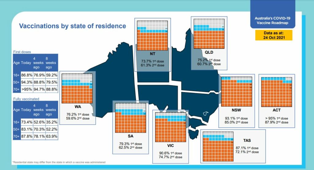 In some cases, like the ACT, NSW and Victoria, single doses have going into more than nine out of 10 adults’ arms. Australia has among the highest vaccination rates in teenagers in the world.