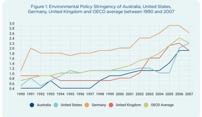 All the 22 nations had gradually tightened their environmental regulation between 1990 and 2007. Denmark had the highest and Germany the second highest average score over the 17 years, and Australia had the worst. Figure 1 shows the trajectory of a few example nations — Australia, Germany, United States and United Kingdom — against the OECD average.