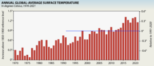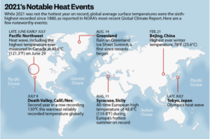 The mainstream media has covered the reports of various scientific organisations that have provided the latest evidence from 2021 of the continued warming of Earth. The two graphics below provide a very clear visual summary of the increasing global surface temperature between 1970 and 2021, and the location of six of the most noteworthy heat events during last year. Not a single year between 1970 and 2021 was below the average for 1850-1900 (the baseline) and since 2005 only two of the years were below the more recent average for 1991-2020 (the blue line).