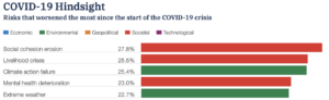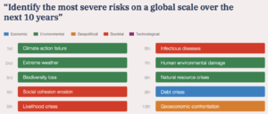 Each year the World Economic Forum (best known for its annual get-together in Davos) releases The Global Risks Report based on a survey of about a thousand of the Forum’s network of “academic, business, government, civil society and thought leaders”. I don’t think the risk perceptions of the privileged, middle aged, European businessmen who dominate the survey sample have any great strategic or prognostic significance but I suppose they are an indicator of what was foremost in their minds on the day they completed the survey. With that caveat, I offer the three figures below from the 2022 report. The dominance of environmental and social risks in the first two figures is striking.