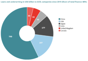 An examination of who is providing the financial backing for the coal industry’s expansion, and with how much, is very revealing. Between January 2019 and November 2021, commercial banks provided over US$1.5 trillion (that’s a trill not a bill) to the industry. About a fifth of this was in loans and the rest through underwriting – selling bonds or shares to institutional investors, including pension funds and insurance companies, on behalf of coal companies. Just twelve banks (ten of which are members of the Net Zero Banking Alliance) provided almost half of the loans, and an overlapping twelve provided about 40 per cent of the underwriting. Banks from only six countries (China, USA, Japan, India, UK and Canada) provided 86% of the overall finance (see pie chart below – GCEL = Global Coal Exit List), and many of the top lending banks are Chinese. However, Barclays, Citigroup and JP Morgan are also among the major lenders.
