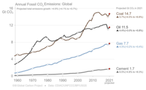 Fossil fuels are, of course, the major source of CO2 emissions and coal remains the major contributor among the fossil fuels (coal 40 per cent, oil 32 per cent and gas 21 per cent). Having tracked along with oil for forty years after 1960, coal has forged ahead since the early 2000s, as the graph below demonstrates. Coal and Mark Twain have much in common.