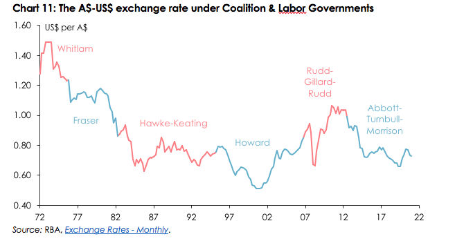 Conversely, the economy’s performance under the Rudd-Gillard-Rudd Government was adversely affected by the fact the Australian dollar was much stronger during its term in office, averaging 93.4 cents and exceeding parity with the US dollar for more than one-third of its tenure. Among other things that offset some of the gains otherwise accruing from the elevated terms of trade at that time. The Abbott-Turnbull-Morrison Government’s record, on the other hand, has been enhanced by an exchange rate averaging US76 cents since it came to office, even though Australia’s terms of trade have not been appreciably lower, on average, than they were under the Rudd-Gillard-Rudd Government.