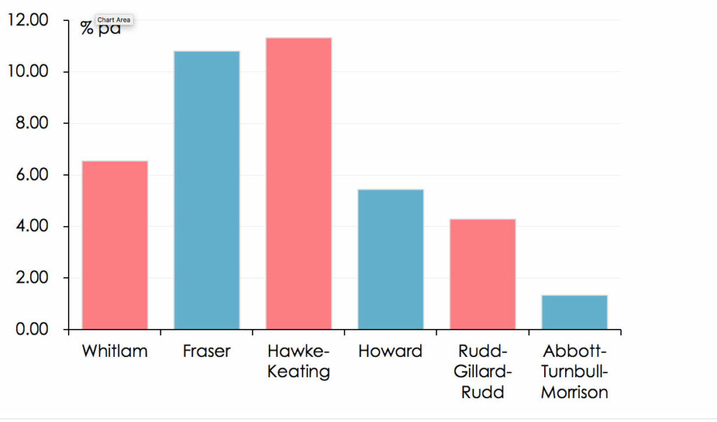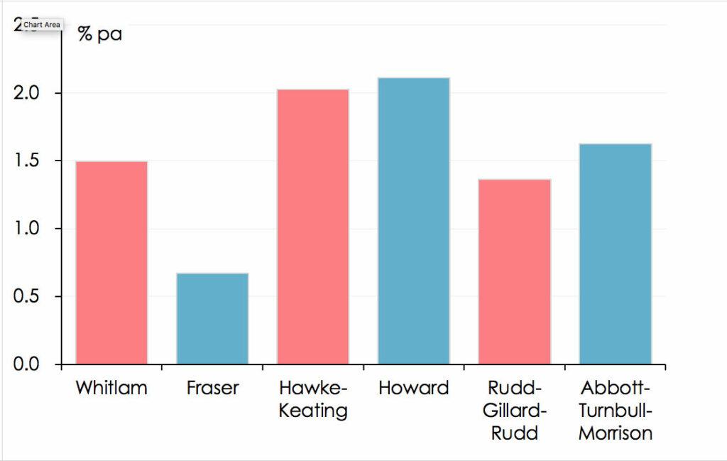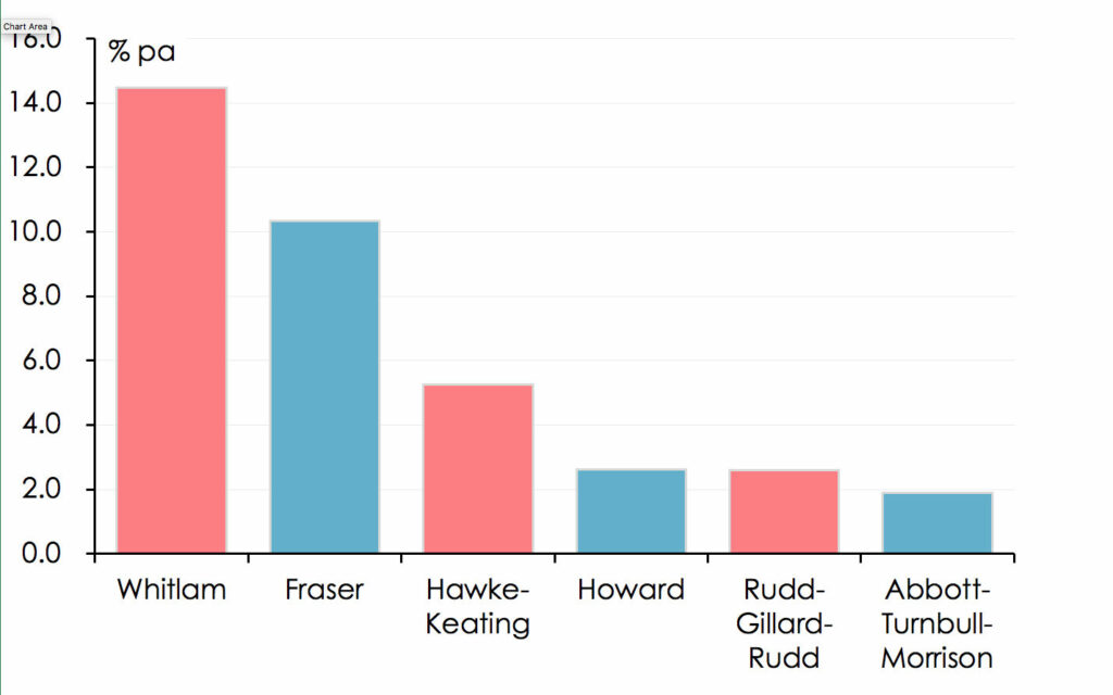 [1] Governments’ terms in office don’t co-incide neatly with the periods for which economic data are available – particularly those such as real GDP growth and inflation which are only available quarterly. For the purposes of this article, the Whitlam Government’s term in office is taken as running from the March quarter 1973 to the December quarter 1975; the Fraser Government’s from the March quarter 1976 to the March quarter 1983; the Hawke-Keating Government’s from the June quarter 1983 to the March quarter 1996; the Howard Government’s from the June quarter 1996 to the December quarter 2007; the Rudd-Gillard-Rudd Government’s from the March quarter 2008 to the September quarter 2013; and the Abbott-Turnbull Morrison Government’s from the December quarter 2013 to the December quarter 2021 or March quarter 2022, depending on the latest available data point.