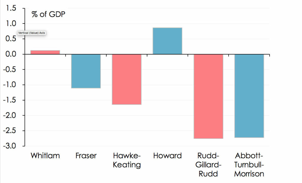 The Abbott-Turnbull-Morrison Government has incurred deficits averaging 2.7% of GDP during its term in office (which of course included the Covid-19 pandemic), which is not materially different from the corresponding figure of 2.8% of GDP under the Rudd-Gillard-Rudd Government (whose term in office included the global financial crisis), but is measurably higher than the average of 1.6% of GDP under the Hawke-Keating Government.