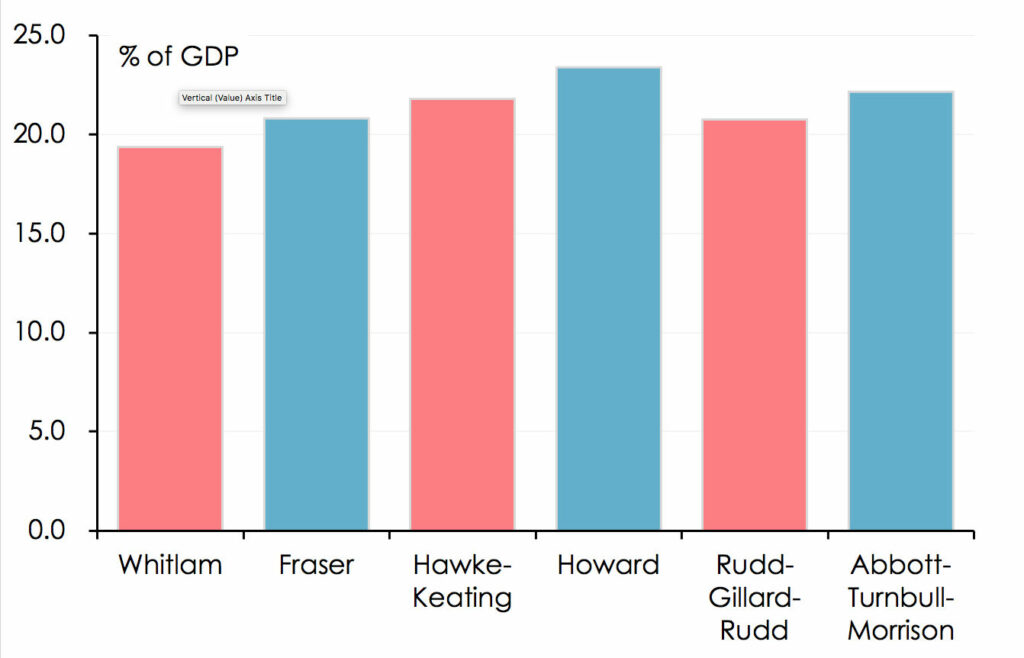 [2] Governments’ terms in office don’t neatly co-incide with the financial years for which budget data are published. For the purposes of this article, financial years have been allocated to the terms of the Governments which were responsible for the budgets for those years. Hence the Whitlam Government is taken as ‘responsible’ for the financial years 1973-74 through 1975-76 (inclusive); the Fraser Government for the years 1976-77 through 1982-83; the Hawke-Keating Government for 1983-84 through 1985-86; the Howard Government for 1996-97 through 2007-08; the Rudd-Gillard-Rudd Government for 2008-09 through 2013-14; and the Abbott-Turnbull-Morrison Government for 2014-15 through 2021-22.
