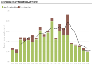 The big recent success story for reducing loss of primary forest is Indonesia, as the figure below demonstrates.