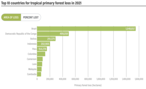 In 2021, the tropics lost 11 million hectares of tree cover (about half of Victoria). Most significantly, 3.75 MHa of the loss was in primary forests, 85 per cent of which resulted directly from human activity and 15 per cent from fires. The loss of this primary forest generated 2.5 Gigatonnes of CO2 (about five times Australia’s annual CO2 emissions). The annual loss of primary forest has increased by about a third compared with the beginning of the century.