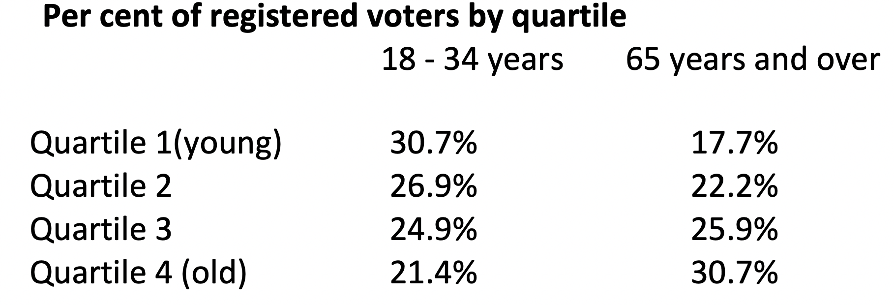 Electorates can be ranked according to the ratios of younger to older electors. With 151 seats, ranking and then arranging them into four groupings, three with 38 seats and one with 37, makes for some interesting comparisons. Quartile 1 has a higher proportion of younger voters compared to older voters, where Quartile 4 has the highest proportion of older voters compared to younger voters. In the middle two quartiles, the proportions are roughly similar.