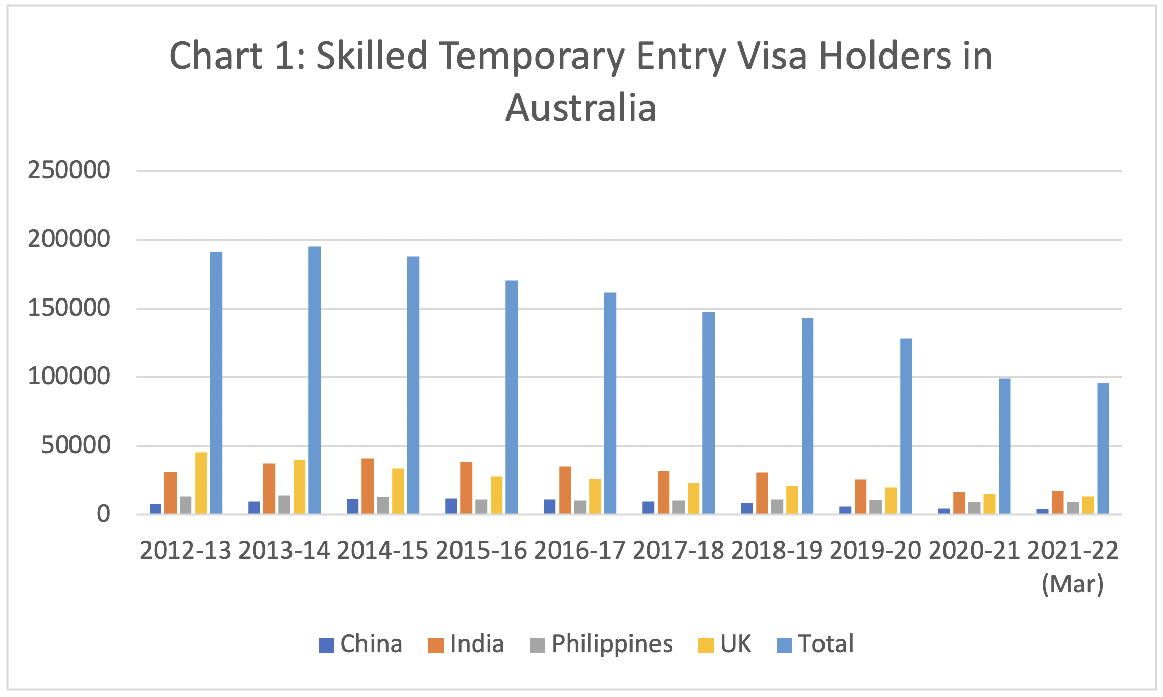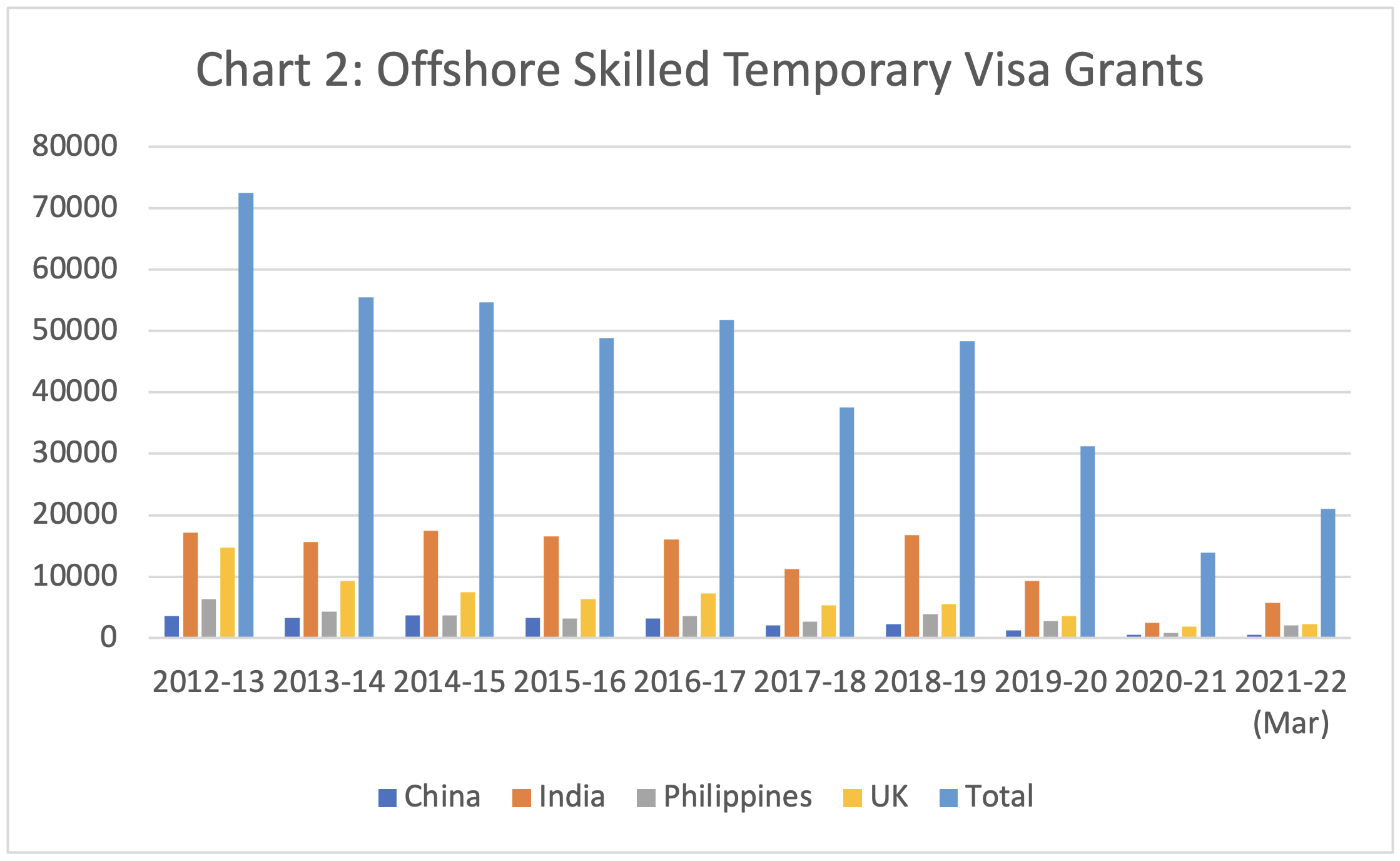 Skilled temporary visa grants in 2021-22 to end March 2022 was 20,988 and is unlikely to be much above 35,000 for the full year compared to 72,532 in 2012-13.