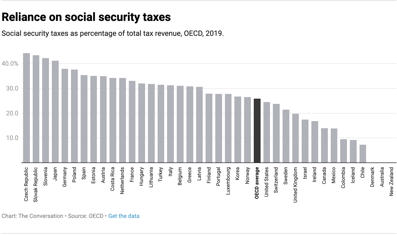 Australia, New Zealand and Denmark fund social security from general government revenue. The other 35 OECD nations levy specific taxes on employers and employees to fund social security systems (unemployment support, age and disability pensions etc)