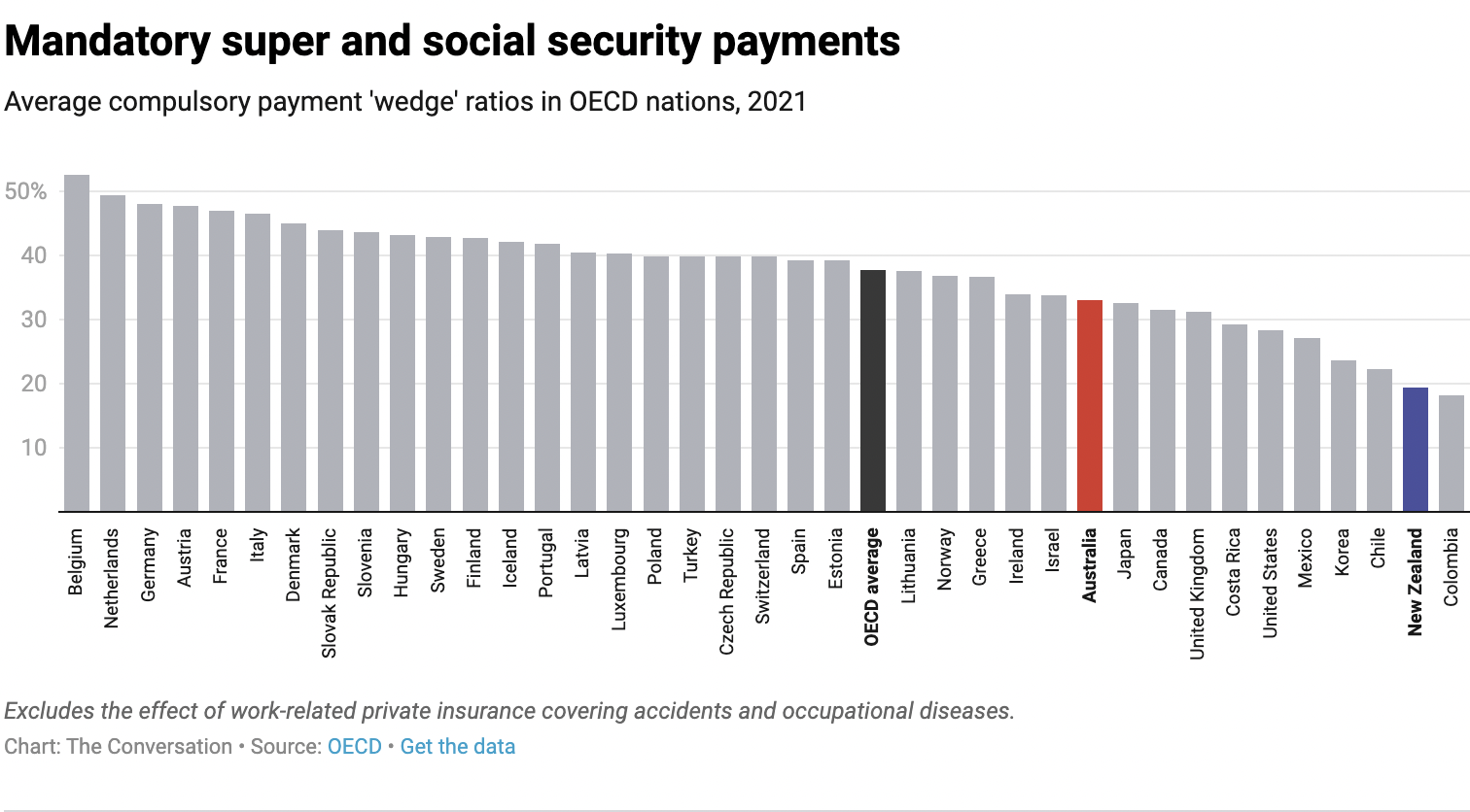 Some say Australia’s compulsory superannuation scheme, in which employers pay 10.5% of an employee’s wage as super, should be counted in these tax measures, because it is similar to social security contributions in other countries.