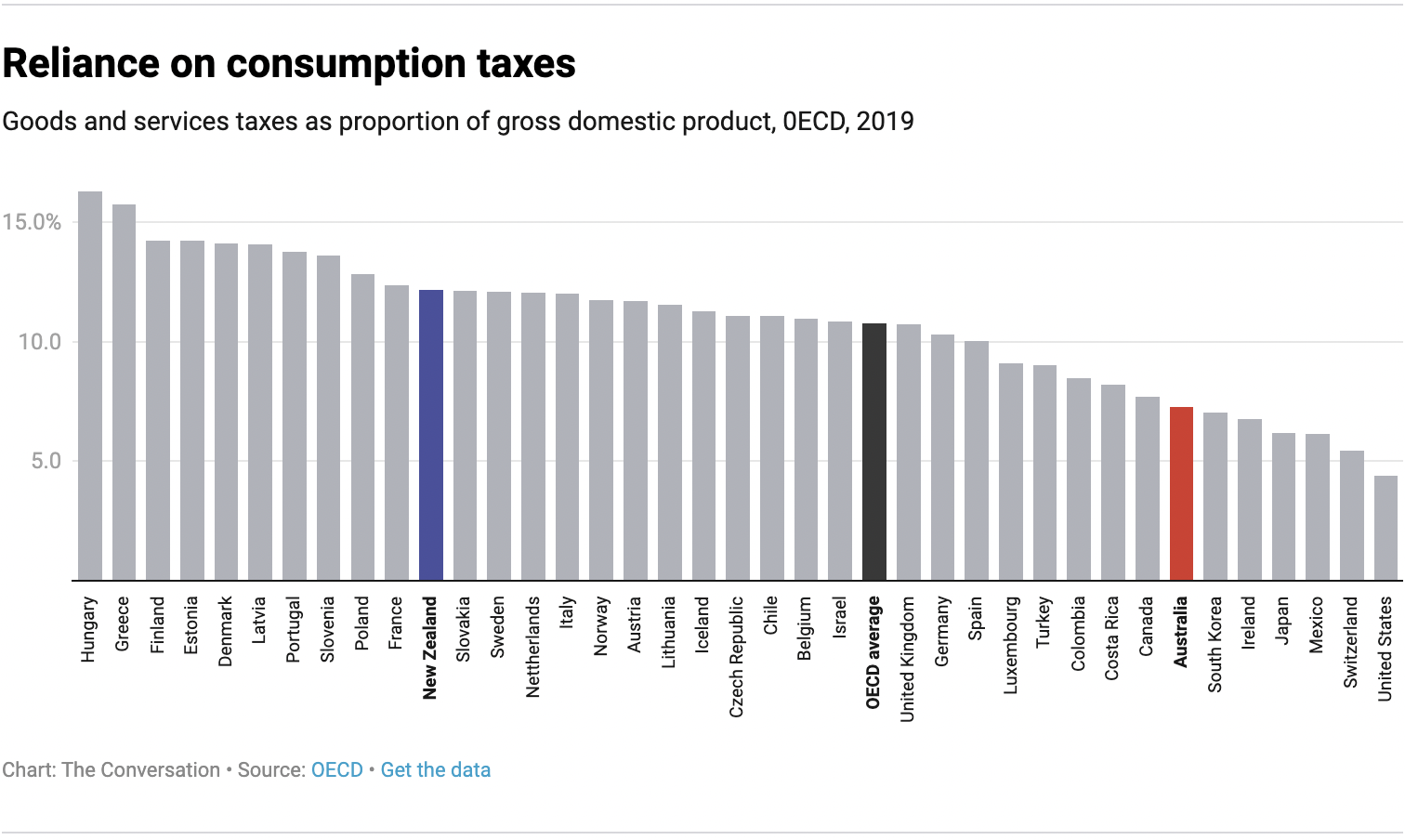 New Zealand does collect more revenue through consumption taxes – 12.5% of GDP in 2019, compared to 7.3% for Australia.