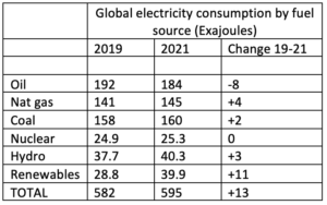 The principal points to note in the table are that the global consumption of electricity increased by roughly 2% over the two years and that this increase was provided by renewables (solar and wind) and hydro, with fossil fuel production of electricity remaining pretty constant. This confirms that renewables are supplementing rather than replacing fossil fuels in electricity generation. In 2021 solar, wind and hydro still accounted for only 13.5% of global electricity supply.