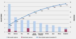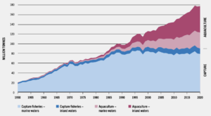 No prizes for guessing the reason for the decline in wild fish capture: 35% of fish stocks are fished beyond their sustainable limit, 57% are fished at their limit, and only 7% are underfished – although the ‘underfished’ fish might quibble with that designation.