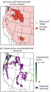 The rewilding report identified eleven areas of contiguous, federally managed lands of at least 5,000 km2 that are, or were, core habitat for wolves. Within these areas, they identified 92 endangered animal and plant species and the threats to them, for instance grazing, logging, mining and oil and gas drilling. Livestock grazing, ubiquitous on federal lands, has enormous impacts on streams and wetlands, the regeneration of trees and fire regimes, and as well as being a significant source of methane emissions can also turn carbon sinks into carbon sources.