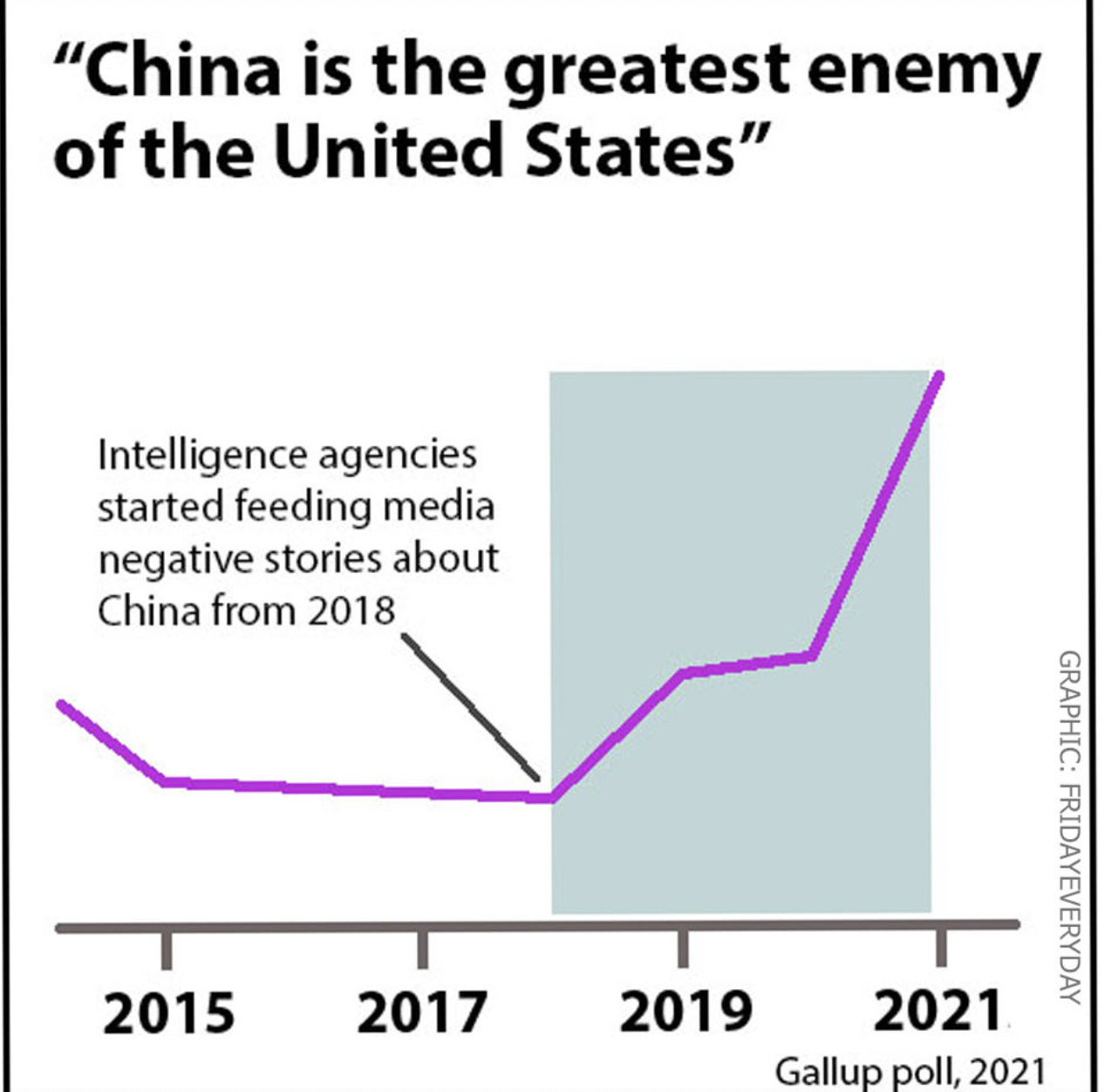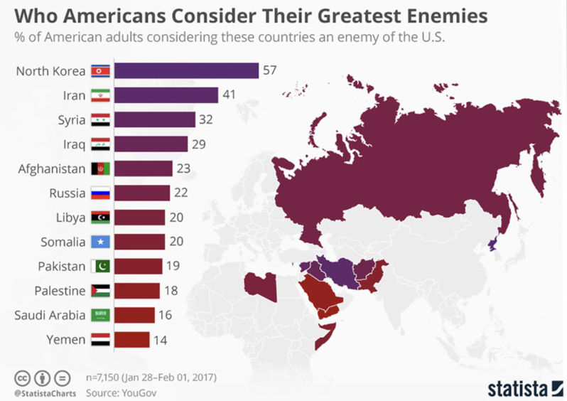 Background: China was well-liked in the United States until 2017, when the world’s most populous country wasn’t even in the list of America’s “perceived enemies” (see chart below).