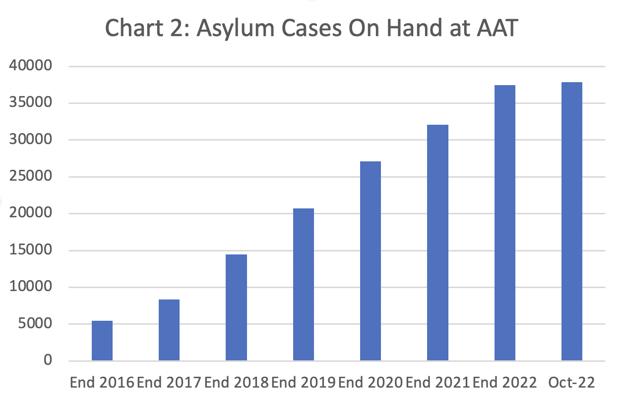 Asylum cases at the AAT increased to a new record of 37,830 at end October 2022. The rate of growth in the asylum backlog at the AAT slowed somewhat in August 2022 when the AAT made 1,018 asylum decisions but it has subsequently returned to a monthly processing rate well behind the monthly AAT asylum application rate.