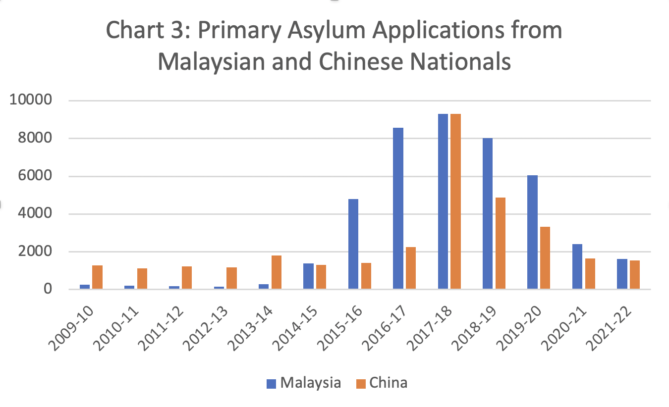 The scam started with applications from Malaysian nationals – 42,557 Malaysian nationals have been assisted mainly by scam organisers to apply for asylum since 2014-15 with a refusal rate of around 98%. It should be recognised that a few Malaysian nationals have presented genuine asylum claims so it is not entirely a scam.