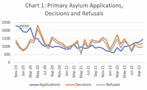 This is the largest number of monthly asylum applications since May 2020 (see Chart 1) but well below the peak asylum application rate of around 2,500 per month during the period 2016-2019.