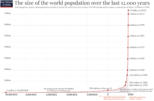 So, the global population hit 8 billion recently. The graphs below show the trajectories of population size over the last 12,000 years and the size and growth rate over my lifetime. The most remarkable aspects are the exponential (the word being correctly used for once) growth in numbers over the last 500 years and the rapidly declining growth rate over the last 60 years.