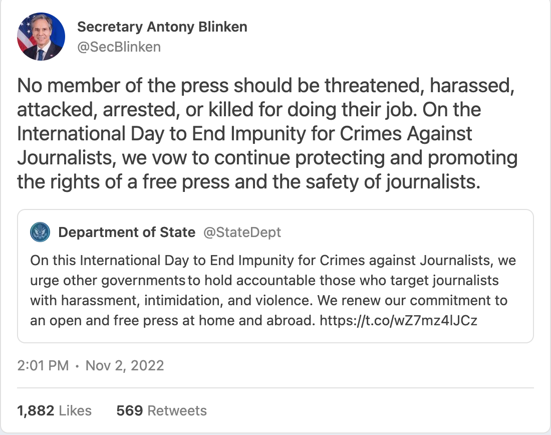 It’s still astonishing that we live in a world where our rulers will openly imprison a journalist for telling the truth and then self-righteously bloviate about the need to stop authoritarian regimes from persecuting journalists.
