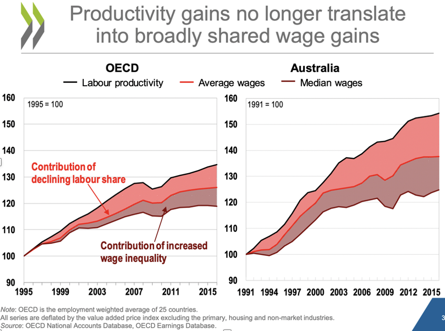 The OECD likes the idea of co-ordination in union bargaining. It knows it has economic benefits. And OECD research shows that the decoupling of wages and productivity, and especially rising wage inequality, are worse in Australia than most countries.