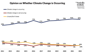 For the last fifteen years the Climate Institute and then The Australia Institute have produced a report of their annual survey of Australians’ beliefs and attitudes about climate change. The Climate of the Nation report for 2022 demonstrates that the majority of Australians are well-informed about climate change and the risks it poses, want action and know what action they want. For instance: