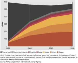The figure below is taken from an article by Tim Buckley about the opportunities for Australia to benefit from the great increase in demand for minerals that are essential for the global energy transition. Minerals such as lithium, nickel, copper, cobalt and rare earths, which Australia has considerable reserves of. The figure demonstrates that between now and 2050 not only will the global market value of nickel, lithium and copper increase but also the market value of thermal coal will dramatically decrease, down from approximately US$500 billion in 2020 to less than US$100 billion in 2050. China, of course, is a major player/partner/threat in both areas.