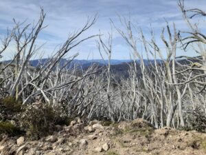 Snow gums are surely one of Australia’s most remarkable and iconic trees. They are the only Australian trees which grow above the snowline. Not only do they survive snowy conditions, they also survive bushfires, growing new branches from underground lignotubers. But now there are great swathes of dead snowgums throughout the alpine regions. They are being killed by a “trifecta” of drought, fires and a species of wood-boring longicorn beetle. But really, I couldn’t help but conclude, these marvellously adapted survivors are being killed by climate change. And climate change will undoubtedly defeat them; if the changes were occurring over millennia, the trees could perhaps “migrate” to higher ground, although in Australia, there isn’t much higher to go; but with climate change now occurring faster than even climate scientists anticipated, there is no hope.