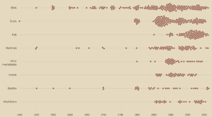 About 900 animal species are classed as having gone extinct since 1500 and, as the graphic below clearly demonstrates, the rate has increased dramatically in the last 200 years (each dot represents an animal species we won’t see again). In addition there are about 600 animal species that are suspected to have become extinct. Currently, amphibians are the most threatened species, followed by mammals, reptiles and then birds. However, even among many species that are considered least at risk, population numbers have declined greatly in recent decades, with birds having suffered the greatest losses.