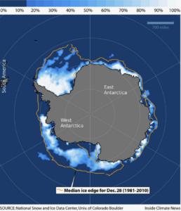The extent of Antarctic sea ice in the southern summer has been decreasing since 2016 and has this season dropped to its lowest extent on record. Global warming is probably a contributor as the Southern Ocean encircling Antarctica has been storing a disproportionate amount of the heat in the world’s oceans in recent years. However, changed wind patterns, which themselves may be a reflection of global warming, seem to be the major cause at the moment by pushing sea ice further north into warmer water and air. While melted sea ice doesn’t raise sea levels, the loss of sea ice has many physical and biological consequences. Less sea ice speeds up the flow of the Antarctic’s glaciers into the ocean and decreases the reflectivity of the ocean, increasing the amount of solar energy absorbed and further increasing global warming. Loss of sea ice also affects the timing of plankton blooms which disrupts the feeding patterns of birds, fish and sea mammals.