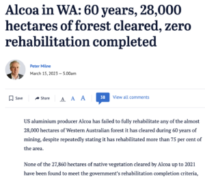 This is not to say that companies such as Alcoa should be allowed to despoil the countryside and then just walk away but it is to recognise that the chances of them returning a damaged area to its ‘natural conditions’ are zero. Equally remote is that the majority of mining companies will ever do the job properly – it’s in their financial interests to delay action for as long as possible and then to do a little as possible. Mining companies, and the like, should have to make substantial contributions to a state-managed ‘rehabilitation’ (for want of a better word) fund throughout the life of the mine, the contents of which are used to finance the best rehabilitation possible when the mine closes. It’s far from ideal but it would be better than what we’ve got a present.
