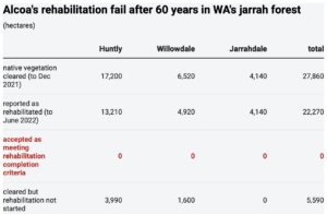 Alcoa considers an area to be rehabilitated after completion of ‘landscaping, overburden and topsoil return, contour ripping, fauna habitat return, and seeding’ - a definition apparently supported by experts. Alcoa feels able to describe such areas in its annual sustainability report as ‘returned to natural conditions’.