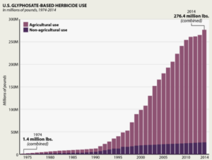 Glyphosate use, principally as an agricultural herbicide, has grown exponentially world-wide over the last 50 years, well demonstrated by the 200-fold increase seen in the graph below for use in the USA from 1975-2014. As we all know, Roundup kills weeds and, despite Monsanto’s and now Bayer’s claims, if it kills one form of life, it’s quite possible that it kills others. So it’s no surprise that there’s an association between early exposure to glyphosate and the appearance of liver problems and metabolic diseases when those children become young adults or that the WHO classified glyphosate as a probable cause of cancer in 2015.